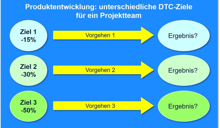 Nachfolgend betrachten wir die Wirkung (Mächtigkeit) unterschiedlicher Kosten-Ziele für ein Design to Cost-Projektteam für die Neuentwicklung eines Nachfolge-Produktes:
